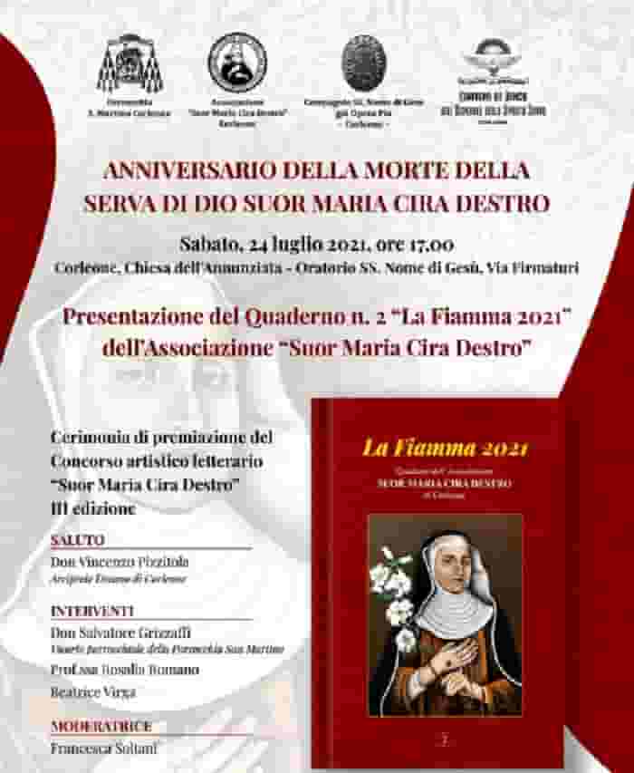 Nata a Corleone nel 1782, fu religiosa clarissa e tutta la sua vita venne vissuta nello sforzo eroico di conformarsi a Cristo nella sofferenza, nell’amore per gli altri, in particolare per i poveri, nella lotta contro il Maligno. Ricordata anche per le piaghe alle mani, ai piedi e al petto nonché per il dono della profezia, è certamente un’interessante figura di santità, la cui fama non si è mai interrotta durante i secoli. Morta il 24 luglio 1818, è attualmente sepolta nella Chiesa Madre di Corleone. Lo scorso anno, alla presenza di mons. Michele Pennisi, arcivescovo di Monreale, è stata aperta la Causa di Beatificazione e Canonizzazione della Serva di Dio. Durante la cerimonia di commemorazione sarà presentato da don Salvatore Grizzaffi il quaderno n. 2 “La Fiamma 2021” dell’Associazione “Suor Maria Cira Destro”, presieduta da don Vincenzo Pizzitola, arciprete decano di Corleone. Saranno, inoltre, premiati gli studenti vincitori della terza edizione del Concorso artistico letterario “Suor Maria Cira Destro”.