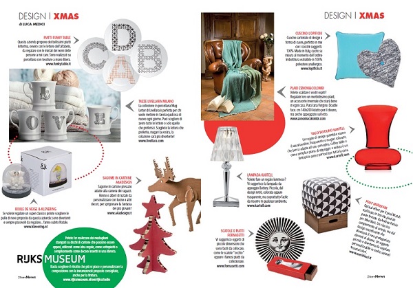 Si avvicina il Natale, le cose da fare sono tante e magari mancano idee per i regali… nessun problema, ecco una breve lista di regali che si possono fare a parenti e amici senza spendere una fortuna, ma con la sicurezza di fare centro! Funky Table propone i piatti lettering, ovvero con le lettere dell’alfabeto, da regalare con le iniziali dei nomi delle persone a noi care. Belle e con lo stesso tema le tazze proposte da livellara Milano. Bianche e con la lettera che preferite saranno una valida idea regalo! Sul sito www.rijksmuseum.nl/en/rijksstudio potete far realizzare dei medaglioni stampati su dischi di cartone che possono essere appesi, utilizzati come idea regalo, come sottopiatti o semplicemente come decoro inseriti in una libreria. Basta scegliere il ritratto che più vi piace e personalizzare la composizione con le innumerevoli proposte consigliate, anche per la finitura. Se volete regalare un super classico potete scegliere una boule de neige di &Klevering. Le palle di neve proposte da questa azienda sono divertenti e sempre piacevoli da regalare… fanno subito Natale. Volete scaldare i vostri ospiti? Regalate loro un morbidissimo plaid Fly di Zenoni&Colombi, un accessorio invernale che starà bene in ogni casa. Adatto per il divano, ma anche appoggiato sul letto. Restiamo in camera da letto per proporre un cuscino realizzato in maglia a forma di cuore realizzato da L’Opificio, adatto per arredare il letto, magari insieme ad altri cuscini di forme diverse. A4Adesign propone delle sagome in cartone pressato adatte alla camera dei ragazzi. Renne e alberi di natale da personalizzare con lucine e altri decori, per sprigionare la fantasia dei più giovani! Un regalo di design potrebbe essere il vaso/tavolino La Boheme di Kartell. Trasparente magari, che ben si adatta ad uso comodino, coffee table o semplice come piano di appoggio/seduta passepartout per tutta la casa. Volete fare un regalo luminoso, sempre di Kartell vi suggerisco la lampada da appoggio Battery. Piccola, dal design retrò, colorata oppure trasparente, ma soprattutto facile da inserire in qualsiasi ambiente. Optical effect per il pouf Match realizzato in tessuto pied de poule firmato da Andrea Parisio per Meridiani. Un classico complemento di arredo, ma dal design accattivante che diventerà il vero protagonista davanti al divano. Un oggetto piccolo e divertente da regalare, personalizzabile in molte varianti tessuto/colori. Visitate anche il sito www.fornasetti.com, troverete molte idee regalo. Vi suggerisco oggetti di piccole dimensioni che sono facili da collocare, come le scatole “occhio” oppure i famosi piatti da collezionare. Adesso dovete solo decidere quale sia il regalo giusto da fare, le idee non mancano, basta solo un pizzico di fantasia! Buon Natale a tutti.