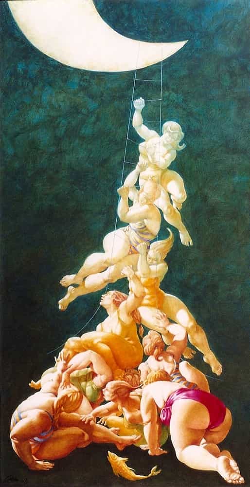 “Rappresenta una scalata alla luna, che è essenzialmente il simbolo di qualcosa che si vuole raggiungere: un’idea, un sogno, un’ideale, qualcosa che ci porti in una dimensione “altra”. In basso c’è la lotta per potersi arrampicare ed è per questo che c’è una variazione di colori dal basso verso l’alto: alla base dove, appunto, c’è lo scontro i colori sono forti, contrastanti, “terrestri” nel senso che sono ancora legati alla realtà, poi, via via che si staccano dalla terra si attenuano e pian piano prendono i colori della luna, cioè del sogno cui si arriverà e con cui ci si fonderà”.