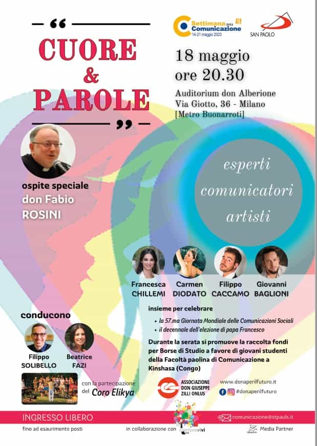 Cuore & Parole è un’iniziativa che i Paolini realizzano per il decennale dell’elezione di Papa Francesco, nell’ambito della Settimana della Comunicazione, un appuntamento promosso da 18 anni in tutta Italia. L’evento si terrà a Milano giovedì 18 maggio 2023, alle ore 20:30, nell’Auditorium don Giacomo Alberione di Via Giotto 36 (Metro Buonarroti) e sarà l’occasione anche per continuare a promuovere l’iniziativa di raccolta fondi dell’Associazione don Zilli in favore di giovani studenti di comunicazione in Congo: un gesto che risponde all’appello lanciato da papa Francesco per sostenere la formazione nel Paese da lui visitato lo scorso febbraio. (www.donaperilfuturo.it). La serata sarà trasmessa in diretta streaming sui canali social di Famiglia Cristiana.