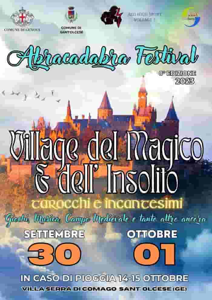 Torna anche quest’autunno, dal 30 Settembre al 1 Ottobre 2023 , nella stupenda cornice che è il Parco di Villa Serra di Comago di Sant’Olcese (Genova), l’8° edizione dell’ ABRACADABRA FESTIVAL “Ovvero il Village del Magico, del Fantasy, dello Storico, del Bizzarro e dell’Insolito”.