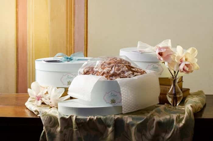 La colomba è avvolta in carta velina opaca dove sono riprodotte le colonne corinzie stilizzate tipiche della collezione Genesi. Un dettaglio, quest’ultimo, che a prima vista non deve apparire proprio come per i capi di alta sartoria. A grande richiesta la Colomba si fa in 3… gusti, tutte da un chilogrammo: la tradizionale Classica A.D. 1552, inimitabile per la sua sofficità di impasto ricco di scorze di arancia candita di Sicilia senza solfiti; Regal Cioccolato, un trionfo di tentazioni per gli amanti del cioccolato; Caramello salato, ricco e goloso grazie alla copertura di cioccolato bianco al caramello e all’impasto arricchito da gocce di cioccolato al latte e crema di caramello al burro salato Le colombe della collezione CAPPELLIERE si distinguono per la scelta di pregiati ingredienti, tutti con certificazione di origine controllata. Gli elementi di base come uova di galline allevate a terra, latte, burro e panna di montagna, nella linea TOP sono freschi. Gli altri ingredienti vengono selezionati in base alle eccellenze territoriali: dal fior di farina allo zucchero italiano, dal sale marino integrale di Cervia ai preziosi ingredienti aromatici, valutati con estrema cura e creatività.