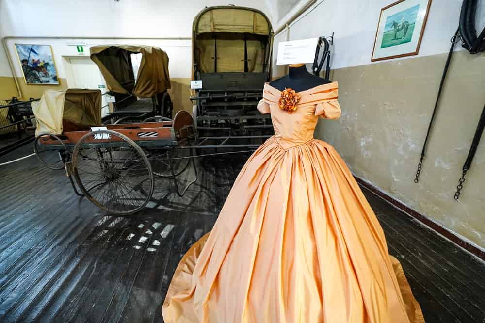 La visita al museo diventa, così, una passeggiata dove i manichini giocano con l’arredo: il museo prende vita e l’eredità della cavalleria vive attraverso gli occhi della moda femminile. Ecco un corsetto, realizzato da Laura Tessaris grazie a un modello conservato in un archivio di Londra: fedelissimo, è un modello del 1888, con fianchi alti, per andare a cavallo.
