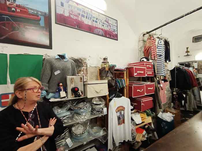 “Questa è la mia preferita,” confessa Rosaria, fermandosi davanti a un’insegna di ferro battuto. Dentro, il negozio era una capsula del tempo: giacche cerate appese come fantasmi, foto in bianco e nero di transatlantici, e una vecchia cassa a manovella. “Qui vestivano i camalli, gli scaricatori del porto. Ma anche i giovani ribelli degli anni ’60 venivano a comprare i maglioni di lana – guardate qui!”. Una delle titolari del negozio tira fuori una giacca blu scuro. “Era di un marinaio che salpò per l’America nel ’23. Tornò vent’anni dopo con un sacco di dollari e un tatuaggio di una sirena. Genova, sa, è fatta di queste storie”.