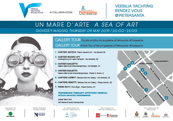 Nautica e arte: un connubio che prenderà forma grazie alla collaborazione tra Versilia Yachting Rendez-vous e il Comune di Pietrasanta. Mostre, musei, negozi, gallerie d’arte e atelier aperti fino alle ore 23. Le gallerie del centro storico di Pietrasanta saranno collegate ai cantieri che espongono al VYR: avranno in esposizione un modellino del cantiere navale abbinato. Tra queste, la Galleria Laura Tartarelli Contemporary Art sarà presente per i Cantieri Maiora GPY (www.maiora.it) con opere di Luna Berlusconi, Andrea Roggi e Eleonora Francioni. In particolare, la serata del 9 maggio sarà dedicata agli armatori ospiti dei cantieri, che dopo la cena servita in Sant’Agostino – bellissimo chiosco di Pietrasanta – faranno un giro in centro a visitare le varie gallerie inclusa quella abbinata al proprio cantiere.