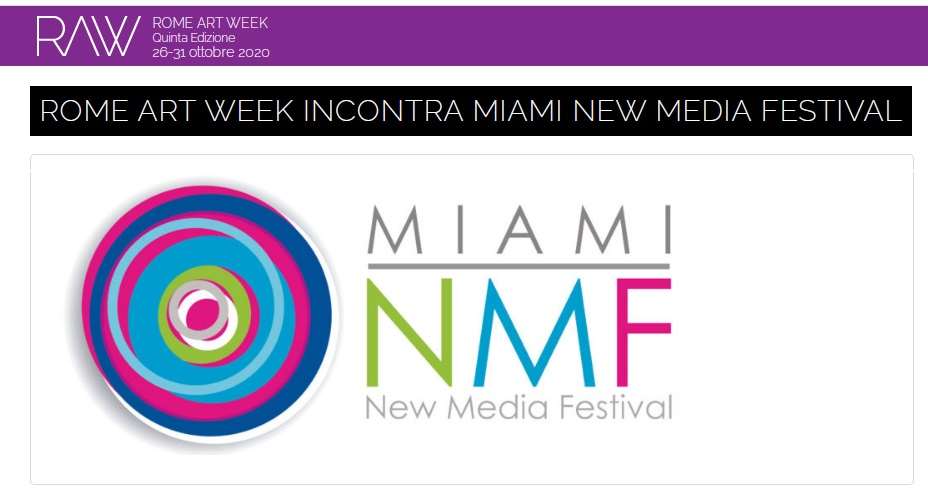 Nella quinta edizione di Rome Art Week riparte la collaborazione con il Miami New Media Festival e si apre la call dedicata a tutti i video artisti che parteciperanno a RAW 2020! I video selezionati saranno esposti, durante la settimana di Rome Art Week (www.romeartweek.com/it) all’evento del Miami New Media Festival (www.miaminewmediafestival.com), che si terrà presso una prestigiosa sede espositiva romana, che verrà rivelata a breve. La partecipazione è completamente gratuita e vi sarà inoltre l’opportunità di vedere la propria opera di videoarte esposta a Miami e nelle altre tappe mondiali del festival.