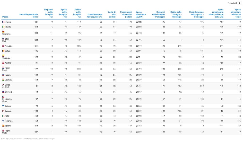 Sempre secondo la speciale graduatoria di BravoSconto, l’Italia si posiziona al 17° posto per abitudine assoluta al risparmio, con un punteggio di -150. Solo il 68% degli italiani ha dichiarato di valutare attentamente ogni acquisto contro il 93% dei francesi. L’analisi ha messo a confronto i dati ufficiali diffusi dall’Organizzazione per la Cooperazione e lo Sviluppo Economico (OCSE), Numbeo (database globale sui consumi) e il Dipartimento per l’Agricoltura degli Stati Uniti. E’ stata quindi stilata una graduatoria dei paesi con i consumatori più attenti alle abitudini di spesa e al risparmio in 25 paesi OCSE (su 37, quelli in cui erano disponibili i dati). Li ha poi aggregati in un indice a punti per trovare quali paesi avessero gli acquirenti più esigenti.