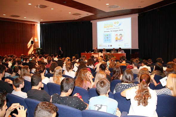 Verona, 19 maggio 2015. Nutrizione: Prendiamoci Gusto! È lo slogan dell’incontro che si è tenuto a Verona il 18 maggio a Palazzo Gran Guardia, a chiusura degli appuntamenti di Maggio Scuola, rivolto a circa 200 studenti delle scuole primarie veronesi. L’evento è stato promosso dalla Fondazione Italiana per l’Educazione Alimentare (FEI) in collaborazione e con il patrocinio dell’Assessorato all’Istruzione del Comune di Verona. Partner dell’evento l’azienda IS’ Company che distribuisce in l’Italia succhi di frutta e verdura del marchio Granny’s Secret, al 100% naturali. Uno sponsor tecnico, Radiomarelli, e due media-partners: il magazine “italiadagustare” e la radio nazionale Latte&Miele. L’obiettivo del convegno era quello di presentare e approfondire con i ragazzi i principi base per un corretto stile di vita al fine di salvaguardare la salute e il benessere proprio a partire dai più giovani. Ha aperto l’incontro Carlo Kauffmann che a nome della società organizzatrice Le Roy ha presentato i relatori: la Prof.ssa Evelina Flachi, nutrizionista e Presidente della Fondazione FEI, il Prof. Antonio Foglio scrittore, docente in diverse Università internazionali e consulente di organismi culturali come l’UNESCO. Presente anche il Capitano del Chievo Verona Sergio Pellisier, accolto dagli applausi dei ragazzi che ha voluto seguire tutto l’incontro intervenendo al termine dei lavori. Ha inoltre portato i saluti del Coach del Calzedonia Verona Volley Andrea Giani – impegnato in Slovenia con la Nazionale – il Team Manager Gianandrea Marchesi, che durante il campionato cura proprio i rapporti con tutti coloro che devono garantire la più corretta alimentazione della squadra.