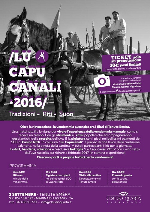 Arriva Lu Capucanali, la vendemmia per turisti e winelovers delle Cantine di Claudio QuartaLecce, È il 31 agosto 2016 la data di scadenza per prenotarsi a partecipare a “Lu Capucanali“, la vendemmia aperta a turisti e wine lovers organizzata dalla cantina salentina di Claudio Quarta Vignaiolo. Oltre la rievocazione “Lu Capucanali” è una vendemmia autentica, che si terrà il 3 settembre 2016 presso le Tenute Eméra, proprio come si faceva un tempo, tra i filari di Tenute Eméra, la cantina di Claudio Quarta che si apre per l’occasione a turisti ed appassionati anche durante le operazioni della raccolta dell’uva. Un’occasione esclusiva con posti limitati per vivere l’esperienza della vendemmia con i ritmi e i rituali di una volta: la raccolta manuale dell’uva, la pigiatura con i piedi nei suggestivi palmenti del ‘500 di Casino Nitti, il casino di caccia appartenuto al primo Presidente del Consiglio del Regno d’Italia del primo dopoguerra, Francesco Saverio Nitti, lo spuntino con i fichi secchi all’ombra dei vigneti e i gesti scanditi dagli strumenti e dai suoni della musica della tradizione popolare. Dopo le fatiche, il pranzo di fine lavori della tradizione salentina, nella pineta della cantina, “Lu Capucanali”,appunto. Una vendemmia vera, dunque, da cui verrà prodotta l’esclusiva bottiglia “Capucanali 2016” che ogni partecipante potrà ritirare (o farsi spedire) a partire da febbraio 2017. In occasione della giornata anche un contest fotografico, per vincere una prestigiosa selezione di vini Claudio Quarta in cassetta di legno, con gli scatti realizzati durante la giornata e postata sulla pagina Facebook.com/ClaudioQuartaVignaiolo. Due i vincitori: la foto che alla scadenza (mezzanotte dell’11 settembre) avrà ricevuto il maggior numero di like e quella che supererà il giudizio della giuria tecnica. “Le tradizioni antiche – commenta Claudio Quarta – non sono soltanto occasioni di folklore, ma rituali da rivivere e rispettare, per custodire e tramandare l’essenza autentica della nostra storia produttiva e culturale. Ci aiutano araccontare il nostro territorio, la storia di una comunità fondata dall’alba dei tempi sulla viticultura, ma anche la nostra azienda, che ha scelto come punto di forza proprio la valorizzazione del territorio e di tutte le cose belle e autentiche che esso racchiude”. L’appuntamento è il 3 settembre 2016 alle 6.00 del mattino a Tenute Eméra (Marina di Lizzano, S.P. 124/ S.P. 123, in direzione Lido Torretta), il pranzo conclusivo è previsto per le ore 12.00. Si partecipa solo su prenotazione, entro il 31 agosto 2016, acquistando il ticket sul sito claudioquarta.it (http://claudioquarta.it/evento-capucanali-2016/) oppure nelle due cantine salentine (Moros a Guagnano e Tenute Eméra a Lizzano). Costo ticket 30 euro; info@claudioquarta.it. |