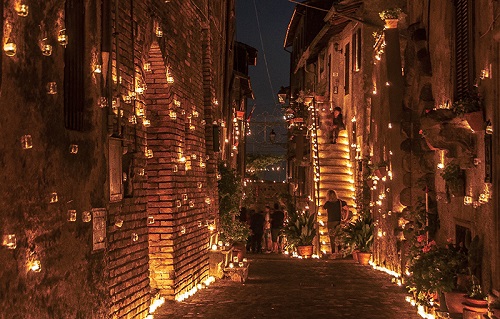 Vallerano (Viterbo) Lazio Nono immancabile appuntamento con la Notte delle Candele di Vallerano che quest’anno, come da tradizione in programma l’ultimo sabato di agosto, vedrà accendere nel cuore del ridente borgo medievale della Tuscia oltre 100000 lumini che scenograferanno ogni via, vicolo, piazza, angolo e balcone. Frutto della collaborazione dell’intera cittadinanza e progetto scaturito dall’Associazione culturale Piccole Serenate Notturne –  Notte delle Candele  che per gioco iniziò qualche anno fa a sperimentare il binomio della notte rischiarata da piccoli ceri con performance artistiche nelle piazze più caratteristiche del Paese, l’evento – organizzato insieme al Comune di Vallerano – ha registrato ultimamente sempre maggiori consensi da parte di pubblico, turisti stranieri e stampa (anche internazionale) da richiamare picchi sempre più allargati di persone, non solo dal territorio viterbese, ma da ogni parte d’Italia. Per contenere questi corposi e incessanti flussi – che tutta la notte di sabato 27 agosto 2016 si alterneranno per l’intero centro di Vallerano, sono stati quest’anno predisposti nuovi parcheggi e un servizio continuo di navette per trasportare gratuitamente ogni convenuto.