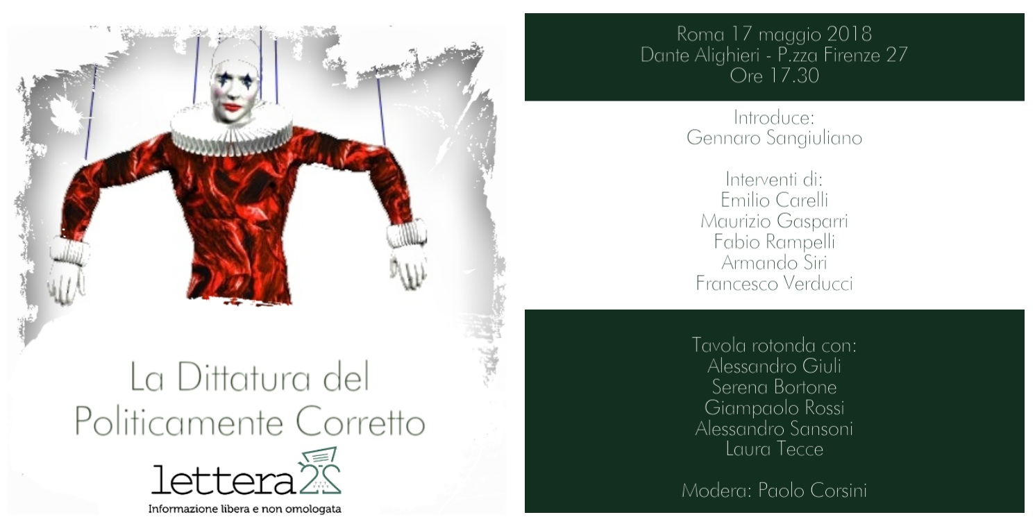 Il politicamente corretto assottiglia sempre più i nostri spazi di libertà. Non siamo più di fronte a una fisima di qualche intellettuale liberale, ma a un problema serio, di politica e di vita. Infatti, il nuovo conformismo culturale, dietro i buoni sentimenti, non tollera chi la pensa diversamente e sa essere estremamente intollerante verso chi non sta ai suoi dettati. Su questo nuovo “regime morale” si confronteranno domani, giovedì 17 maggio 2018, alle ore 17.30, presso la Dante Alighieri, Piazza di Firenze 27- Roma, giornalisti, politici e intellettuali. L’appuntamento, suddiviso in due parti, prevede nella prima sessione interventi politici di diversi schieramenti. Introdotti dal vicedirettore del tg1 Gennaro Sangiuliano, interverranno il sen. Emilio Carelli (Movimento 5 Stelle), il sen. Maurizio Gasparri (Forza Italia), l’on. Fabio Rampelli (Fratelli d’Italia), il sen. Armando Siri (Lega) e il sen. Francesco Verducci (Partito Democratico). Durante la seconda parte, si terrà la tavola rotonda con i giornalisti, comunicatori e intellettuali: Alessandro Giuli, Serena Bortone, Pierangelo Maurizio, Angelo Mellone, Giampaolo Rossi, Alessandro Sansoni, Edoardo Sylos Labini, Laura Tecce. Modera: Paolo Corsini (Presidente Lettera22).