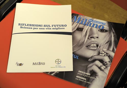 Milano, 30 settembre 2013. Nella centralissima sede dell’Urban Center in Galleria Vittorio Emanuele II, a Milano, è stato presentato oggi alla stampa il progetto “Riflessioni Sul Futuro”, ideato dal mensile Milano 24orenews in collaborazione con il Gruppo Bayer in Italia e patrocinato dal Comune di Milano. Hanno presentato il programma Dario Bordet e Carlo Kauffmann di Milano 24orenews, Daniele Rosa, Direttore della comunicazione di Bayer ed Evelina Flachi, VicePresidente della Fondazione Italiana per l’Educazione Alimentare (Foodedu). In vista dell’Expo 2015 e della crescente attenzione e sensibilizzazione ai temi trattati, Bayer ha voluto rivolgere questi incontri soprattutto ai giovani che, oggi più che mai, guardano con grande attenzione al proprio futuro e alla propria crescita personale e professionale. E in prima fila oggi non potevano che esserci proprio i giovani, otto ragazzi che, selezionati dalle ultime classi delle scuole superiori (Liceo Classico San Raffaele di Segrate e le scuole milanesi Salesiani, Liceo Scientifico L. Da Vinci, I.I.S. Carlo Cattaneo e Istituto Magistrale Agnesi). L’interessante novità è che saranno proprio loro a porre domande ai vari relatori e non il pubblico in sala innescando così una serie di “riflessioni sul futuro”.