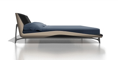MBS 004 Bed – Come la chaise longue, il letto è caratterizzato da una linea molto elegante e da un telaio in legno di forma tridimensionale. La struttura in alluminio anodizzato grigio-blu ed il rivestimento in pelle o tessuto grigio con cuciture in risalto creano un contrasto ottico con il guscio in legno grigio chiaro.