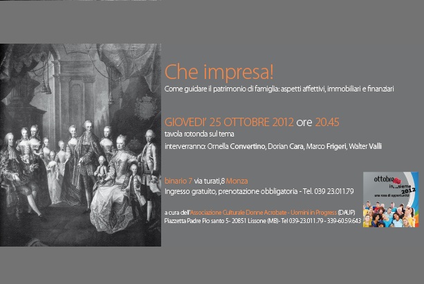 Quattro professionisti, specializzati in psicologia, storia dell’arte, gestione immobiliare e settore finanziario e creditizio, analizzeranno, in una tavola rotonda sul tema aperta al pubblico, strumenti, tempi, modalità e soluzioni indicative utili nel cogliere il reale bisogno del patrimonio familiare, indicando quali potranno essere i potenziali motori di un nuovo pensiero progettuale.
