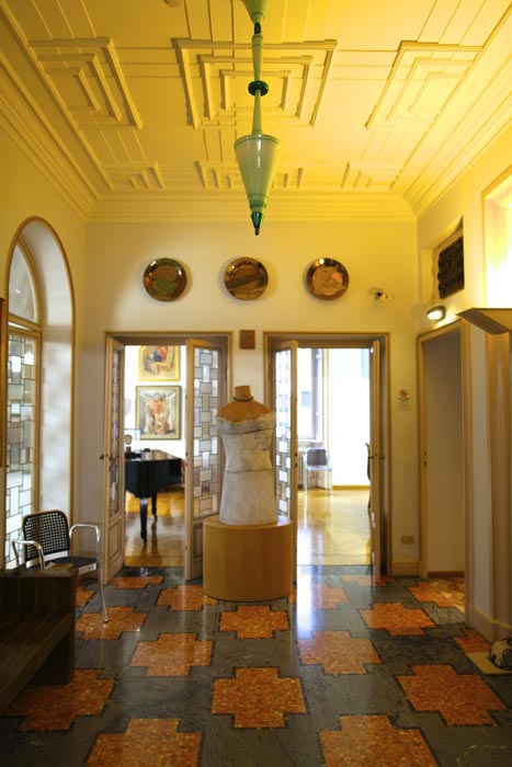 All’ingresso si trovano i ritratti dedicati ai coniugi Boschi e subito, sulla sinistra, c’è un corridoio con tele di Severini e di Boccioni. Su questo corridoio si aprono due porte, la prima riguarda il bagno padronale, con ancora alcuni elementi originali e con la nicchia della vasca centrale speculare alla nicchia dello specchio sul lavello, mentre la porta di fronte fa da ingresso alla stanza del “Novecento italiano” con quadri di Funi, Marussig, Tozzi, Carrà e Casorati.