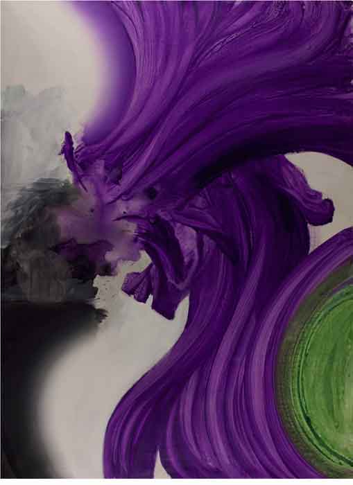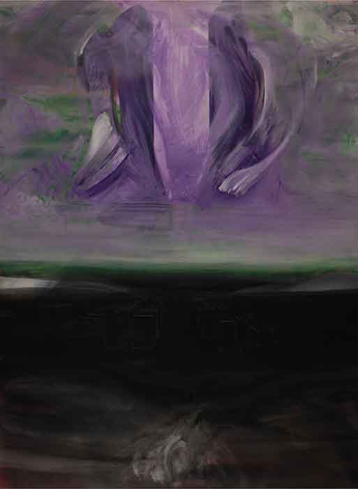 Entrando nella galleria, si è accolti da un viola sacrale e un verde ipnotico che dominano le 15 tele di grandi dimensioni. Sono opere “fisiche”, sì, ma costruite su teloni di PVC riciclato da vecchi manifesti pubblicitari – un gesto che trasforma lo scarto in spiritualità.