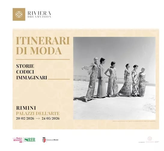 Dal 20 febbraio al 24 maggio 2026 i Palazzi dell’Arte di Rimini ospitano “Riviera Dream Vision – Itinerari di moda. Storie, Codici, Immaginari”, un’esposizione che racconta 75 anni di moda Made in Romagna. La mostra, allestita negli storici Palazzo dell’Arengo e Palazzo del Podestà, si sviluppa su 1.430 mq e ripercorre la storia del distretto romagnolo dagli anni ’50 a oggi. In esposizione oltre 80 abiti, 120 calzature, bozzetti, figurini, campioni tessili, campagne pubblicitarie, video e materiali d’archivio.