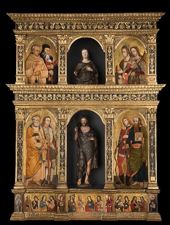 Il Polittico di San Giovanni Battista torna a casa dopo un anno di assenza e il Museo Bagatti Valsecchi ne celebra il rientro producendo una piccola mostra, curata da Chiara Paratico, che fa il punto su quest’opera, tanto intensa quanto portatrice di misteri. Realizzato nel 1493 da Giovanni Marinoni con i figli Bernardino e Antonio, il Polittico è l’unico dipinto giunto fino a noi firmato e datato dalla bottega Marinoni. Allestito in mostra fino al 2 ottobre, e poi ricollocato nella sua originaria posizione sullo scalone di via S. Spirito, il Polittico è allestito insieme ad uno schermo touch con un video che consente di contestualizzare e conoscere l’ampia attività dei Marinoni nel territorio di Bergamo.