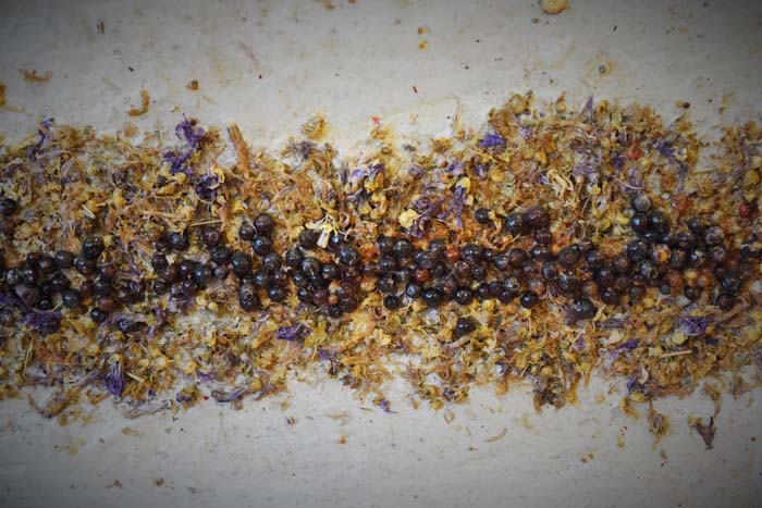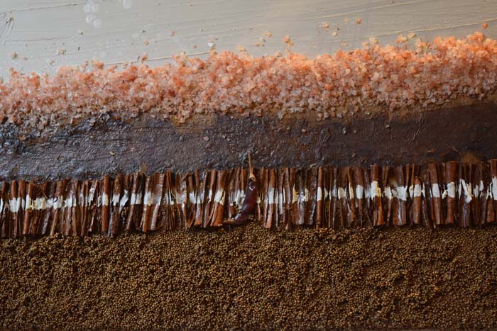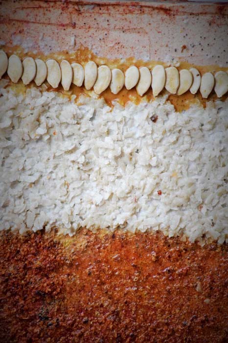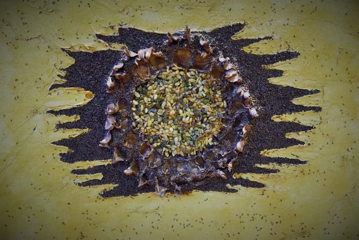 Licia Fusai espone le sue ultime creazioni realizzate con quegli ingredienti che di solito sono usati per preparare o insaporire le sue ricette di cucina: semi di girasole, sale dell’Himalaya nelle sue svariate sfumature, pepe rosa, verde, nero, bacche di cannella, vividi peperoncini.