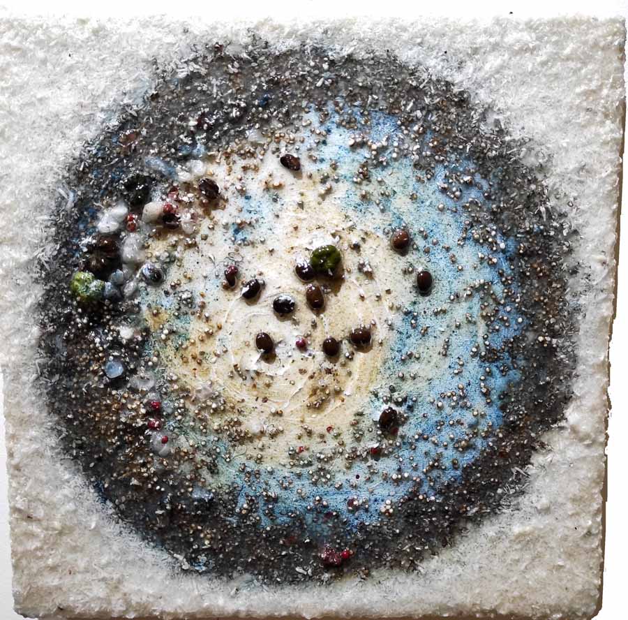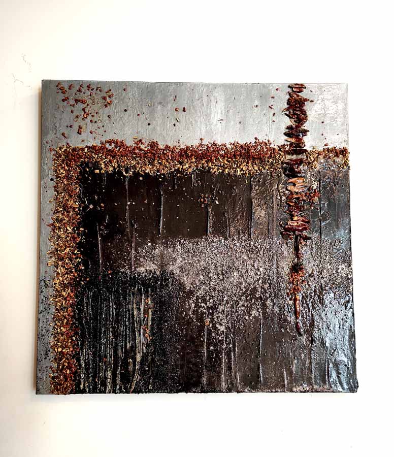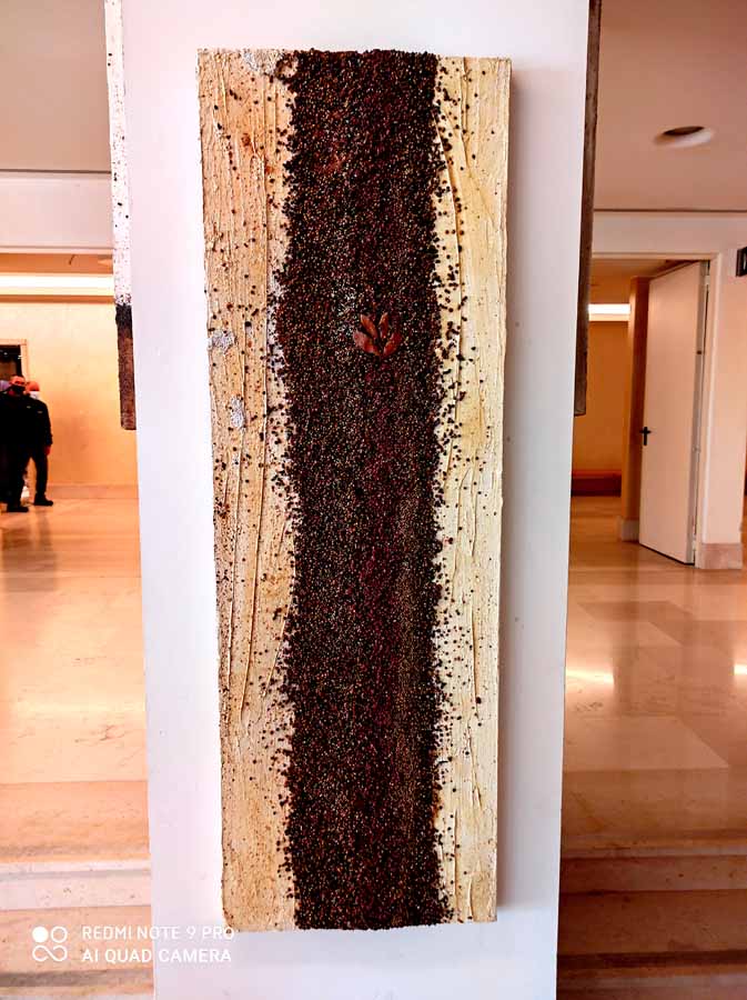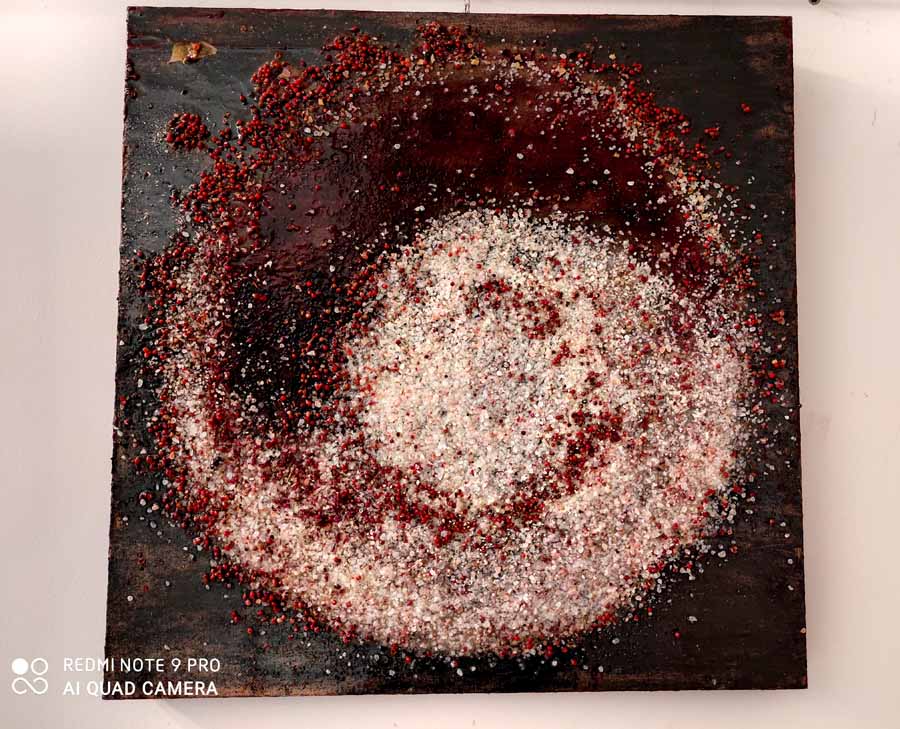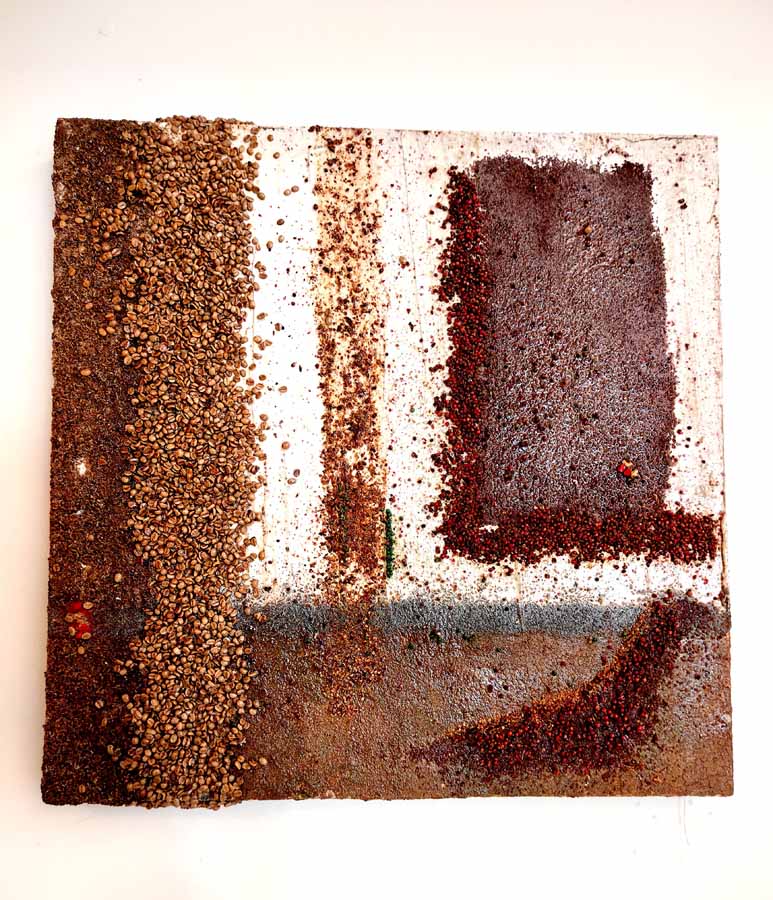 Cannella, peperoncino, chicchi di caffè, semi di papavero si mescolano al curry e all’anice in un concentrato di forme, colori e profumi che inducono lo spettatore a farsi catturare dall’opera stessa, evocando ricordi di viaggi ed esperienze passate.