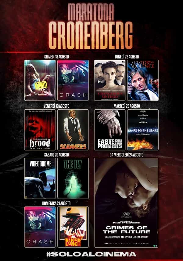 La maratona cinematografica dedicata al regista di culto David Cronenberg arriva dal 18 al 23 agosto al cinema Quattro Fontane di Roma, all’Anteo Palazzo del Cinema a Milano e all’Ambrosio di Torino. Per l’occasione i film saranno proiettati in versione originale sottotitolata.