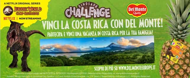 - L’utente potrà caricare una foto o un video che rappresenti la propria interpretazione di un dinosauro accedendo al link https://delmonteeurope.it/vinci-costarica. Per realizzare la foto o il video l’utente può utilizzare i prodotti Del Monte della linea promozionata “Jurassic” contraddistinti dall’apposito sticker/collarino promozionale.