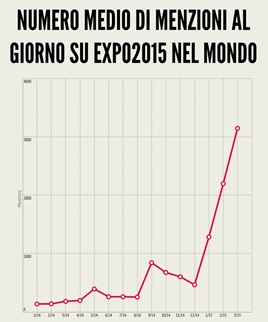 Un interesse verso l’Expo che sta vivendo un boom da gennaio 2015 in poi, con una punta di quasi 62 mila commenti nel solo mese di febbraio 2015. In media le menzioni al giorno sono passate dalle 394 di maggio alle 3.143 nei primi 4 giorni di marzo 2015. D’altra parte rispetto alla media giornaliera degli ultimi due mesi del 2014, nei primi due mesi del 2015, il numero medio di menzioni segna +312%. Emerge da un’analisi della Camera di commercio di Milano attraverso Voices from the Blogs, spin off dell’Università degli Studi di Milano (www.voicesfromtheblogs.com) realizzata su 146mila commenti in Rete pubblicati non in italiano e non provenienti dall’Italia dal 1 novembre 2014 al 4 marzo 2015.
