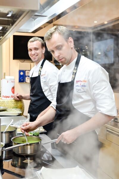 Milano, 9 settembre 2015 – Non poteva iniziare che da Expo la tournée enogastronomica in Italia dei gemelli Sergey e Ivan Berezutskiy, Ambassador della Russia presso l’Esposizione Universale. Ribattezzati da molti addetti ai lavori come gli “alfieri della cucina pre sovietica”, si sono affermati, grazie al loro “Twins” nel centro di Mosca, attraverso una gastronomia basata sui sapori della tradizione russa, rivisitati secondo le più moderne tecniche culinarie. I due cuochi hanno presentato le loro creazioni all’interno del pop-up restaurant Identità Expo San Pellegrino, stupendo il pubblico con il loro stile, i loro colori e la loro inventiva, frutto di un mix di esperienze internazionali di altissimo profilo.