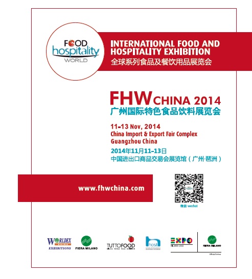 La terza edizione di FHW Cina si terrà dal 11 al 13 novembre 2014 a Canton, nella provincia del Guangdong. Food Hospitality World Cina è organizzata da Fiera Milano in collaborazione con Worldex che da oltre 20 anni vanta un’esperienza di successo nel supporto all’organizzazione di manifestazioni professionali e conferenze.