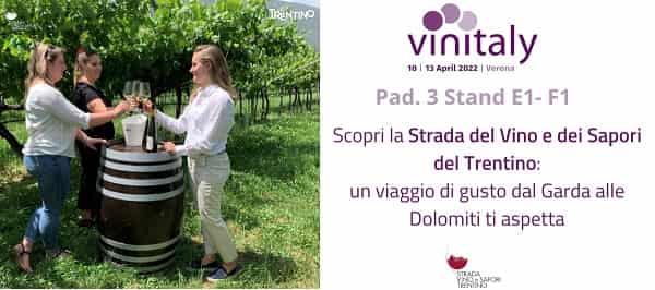 Da domenica 10 a mercoledì 13 aprile 2022, la Strada del Vino e dei Sapori del Trentino torna a Vinitaly di Verona per promuovere le eccellenze dei suoi produttori e le iniziative in programma nel corso dell’anno.  L’appuntamento è al Padiglione 3, Stand E1-F1, presso lo stand Trentino, accanto a Consorzio Vini del Trentino, Fondazione Edmund Mach, Istituto Trentodoc, Istituto Tutela Grappa del Trentino, Palazzo Roccabruna – Enoteca Provinciale del Trentino, Trentino Marketing, Consorzio Turistico Piana Rotaliana Königsberg.