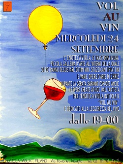 Sarà l’occasione per prendere visione della nuova veste grafica del locale, realizzata dall’eclettico artista, il quale ha voluto dedicare le sue prime opere realizzate per Viola Enoteca alla leggerezza del vino, intitolandole, con un gioco di parole, “Vol-au-Vin”. Così , un calice di vino “prende il volo” attaccato a un palloncino mentre una bellissima farfalla ha un corpo “di vino”.
