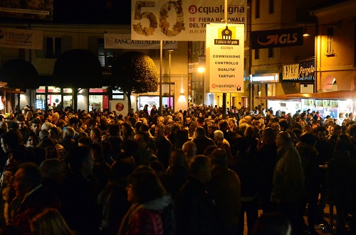 Acqualagna (PU) Pienone in piazza Mattei e per la presentazione del volume sui 50 anni di storia Complice la bellissima giornata di sole (che gli esperti del meteo chiamano estate di San Martino)e la Borsa del Tartufo che indica un prezzo più basso per il prezioso Tubero (siamo sui 1.400/1.500 euro al chilo per le piccole pezzature contro 1.800/2.000 euro a inizio Fiera) fatto sta che Acqualagna, capitale del Tartufo, ha registrato il consueto pienone per domenica di Ognissanti. “E’ gratificante – dichiara il sindaco Pierotti – poter offrire in queste giornate un prodotto di ottima qualità ed estrema bontà, capace con il suo profumo e sapore di inebriare ed emozionare i tanti appassionati in arrivo”. Nel segno della trasparenza e per una piena tutela delle decine di migliaia di persone che ogni anno scelgono di visitare le fiere del tartufo, Acqualagna mette a disposizione dei consumatori una commissione che valuta l’autenticità del Tartufo Bianco Pregiato tutelandolo da eventuali acquisti sbagliati. L’interesse per l’andamento dei prezzi del Tartufo lo si constata nella fila di visitatori agli stand dei commercianti di Tartufo in piazza Mattei, dove è impossibile resistere alla voglia di tartufo e tornarsene a casa privi. Una giornata molto partecipata grazie anche ai tanti eventi in programma al Salotto da gustaregremito per la presentazione del volume “Acqualagna Capitale del Tartufo. 1966 – 2015/ 50 anni di Fiera, Storia, Uomini, Passione”. Un’opera, con oltre duecentosettanta pagine, che raccoglie mezzo secolo di storia, attraverso le immagini e i ricordi più significativi, tra i quali quelli di personaggi e ospiti illustri, insieme ai momenti più rilevanti, i ricordi e tante curiosità delle trascorse edizioni, a partire dalla prima del lontano 1966.