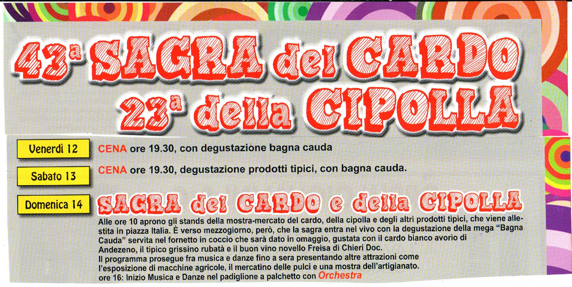 Andezeno, una sagra storica si prodotti locali e autoctoni del territorio. Siamo alla 43 Edizione della Sagra del cardo, della bagna caoda e della cipolla piattellina. Domenica 14 ottobre 2018, durante tutta la giornata, la storica sagra , mostra mercato dei prodotti tipici, cardi e le cipolle piattelline, varieta’ pregiate conosciute nel mondo per le loro ottime caratteristiche gastronomiche, zucche ornamentali e commestibili in collezione, collezione di peperoncini in vaso e frutti, degustazione della bagna caoda e del buon vino freisa servita dalla proloco di Andezeno. Inoltre in occasione della sagra sarà possibile visitare la ‘Casa delle Zucche’, corso Vittorio Emanuele 69, Andezeno, che da oltre 25 anni,  nella stagione autunnale viene completamente addobbata da centinaia di tipologie di zucche.
