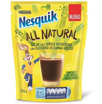 Un nuovo amico per la colazione, un nuovo amico per il Pianeta Più cacao, solo 5 ingredienti 100% naturali e pack in carta riciclabile per iniziare bene la tua giornata – Una colazione bilanciata, sana e nutriente non è solo il primo passo per iniziare al meglio la giornata, ma può rivelarsi anche un’ottima occasione per fare del bene a noi stessi e al pianeta. Per questo oggi Nesquik aggiunge ufficialmente alla propria gamma in Italia Nesquik All Natural, un prodotto che si distingue per una ricetta semplificata, con soli 5 ingredienti 100% naturali, cacao sostenibile dall’Africa Occidentale, certificato UTZ, e per il confezionamento in un sacchetto di carta riciclabile. La nuova formulazione di Nesquik All Natural prevede una maggiore percentuale di cacao rispetto a Nesquik Opti-Start. Nesquik All Natural, inoltre, ha meno zucchero rispetto al prodotto classico, e utilizza zucchero di canna grezzo invece dello zucchero bianco.