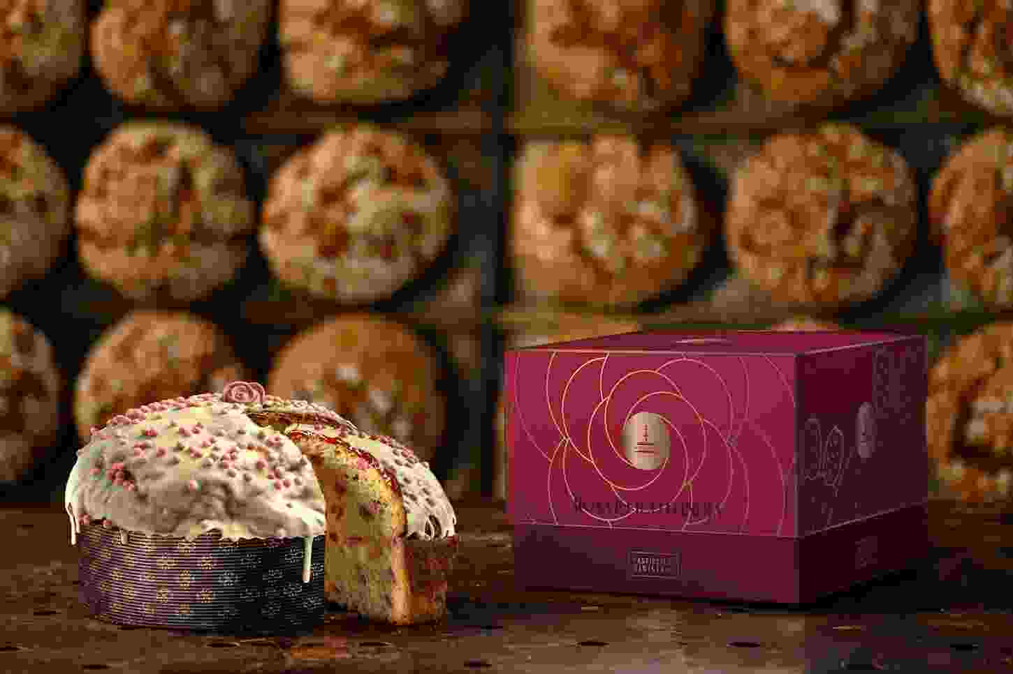 Un panettone a lievitazione naturale, all’essenza di petali di rose con gocce di cioccolato rosa dal particolare gusto fruttato