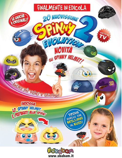 Gli Spinny sono stati un prodotto di grande successo tra i bambini di tutte le età. Una macchinina incontrollabile capace di ruotare su se stessa diventando una coloratissima trottola. L’incredibile successo di questo giocattolo ha portato Sbabam a creare una sua evoluzione. Sono le Spinny evolution 2 che, rispetto al modello precedente, presentano nuove particolarità per rendere l’esperienza di gioco ancora più unica e divertente. La principale novità è lo Spinny Helmet, ossia uno speciale casco che permette alla trottola di ruotare meglio e offre alla macchinina nuove combinazioni di colori. Inoltre brillano al buio e girano più veloci per rendere le sfide ancora più mozzafiato. Ogni trottola presenta nuovi personaggi come Apache, Ape e Coccinella, curati nei minimi dettagli. Ogni Spinny viene venduta con lo Spinny Helmet, il Power Ring, la Launch Base, una speciale card e un Minibook. Nata come distaccamento di TemaProm, Sbabam prende il volto da un team di professionisti creativi e dinamici, pronti in ogni momento a sviluppare spunti e a trasformarli in oggetti. Un gruppo di persone con una grande esperienza animata da passione, ambizione e amore per il proprio lavoro. #Sbabam è il brand leader nei giochi e collezioni in edicola e si dedica all’ideazione, progettazione e commercializzazione di accessori, giochi e oggetti divertenti e coloratissimi.