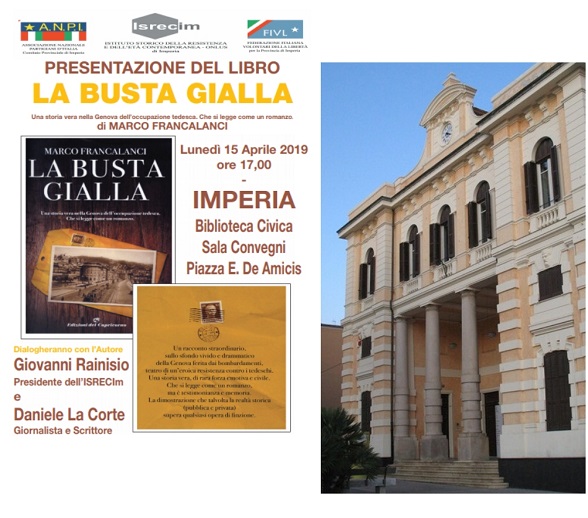Un evento promosso dall’Istituto Storico della Resistenza e dell’Età Contemporanea di Imperia L’ISRECIm, Istituto Storico della Resistenza e dell’Età Contemporanea di Imperia, insieme all’ANPI e alla FIVL di Imperia,ha promosso la presentazione del libro “LA BUSTA GIALLA” di Marco Francalanci pubblicato da Edizioni del Capricorno. L’evento lunedì 15 aprile 2019 alle ore 17.00 a Imperia presso la Sala Convegni della Biblioteca Civica “L. Lagorio” (Piazza E. De Amicis). L’autore dialogherà con Giovanni Rainisio, Presidente dell’ISRECIm e Daniele La Corte, giornalista e scrittore. Si tratta di una storia straordinaria, ma soprattutto vera, un racconto autobiografico che narra le vicende di una famiglia in una Genova ferita dai bombardamenti poi sconvolta
