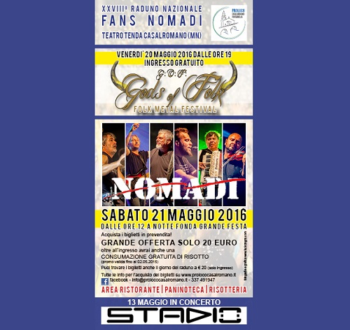 Sabato 21 Maggio 2016 si terrà al Teatro Tenda di Casalromano (MN) – il XXVIII raduno nazionale (l’originale!) dei fans dei NOMADI, uno dei primi gruppi musicali d’Italia, nato 53 anni fa solo sei mesi dopo la nascita dei Rolling Stone.