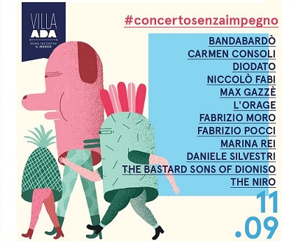 Domenica 11 settembre sul palco di Villa Ada Roma Incontra in Mondo (organizzato da Viteculture e Arci Roma), come ultimo appuntamento della stagione 2016, saliranno tutti insieme sul palco del laghetto più amato della capitale (a partire dalle 19.30) Carmen Consoli, Max Gazzè, Niccolò Fabi, Daniele Silvestri, Bandabardò, Fabrizio Moro, Marina Rei, The Niro, The Bastard Sons of Dioniso, L’Orage, Diodato per Concerto Senza Impegno: una vera e propria festa all’insegna della musica italiana d’autore degli ultimi 30 anni.