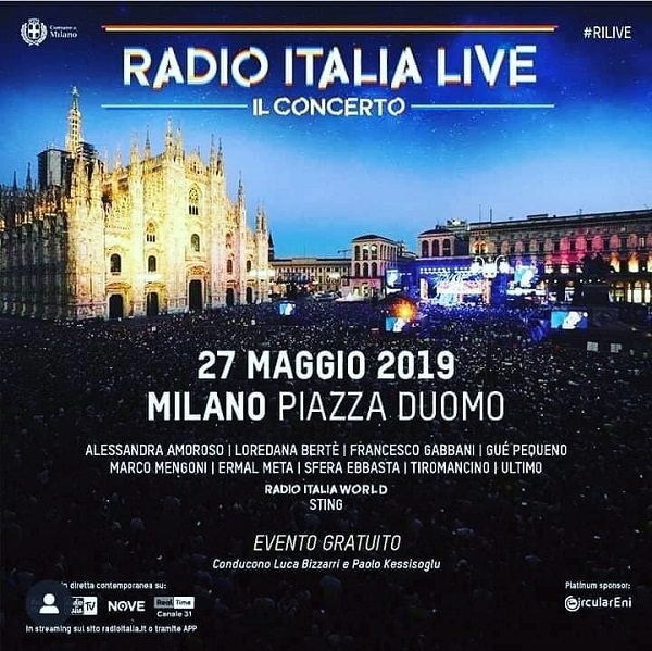 Piazza Duomo accoglie Radio Italia Live 2019, il concerto gratuito organizzato da Radio Italia, ormai per l’ottavo anno di fila. L’attesissimo evento ospita i principali artisti del momento. Questa volta, inoltre, prevede una doppia edizione: Milano il 27 maggio e quella al Foro Italico di Palermo il 29 giugno. “In questo momento storico in cui tutto è virtuale, essere tutti in piazza insieme e divertirsi senza paura ha un grande significato. – afferma il sindaco di Milano Giuseppe Sala alla conferenza stampa di presentazione del concerto. E continua – Inoltre, io penso che per Milano sia fondamentale continuare a mantenere un aggancio storico con le città del sud, perché chi è arrivato dal sud ha fatto grande Milano”. L’evento è realizzato grazie alla collaborazione con il Comune di Milano Cultura ed è condotto per la seconda volta consecutiva dalla coppia televisiva storica composta da Luca Bizzarri e Paolo Kessisoglu. Anche quest’anno, il duo comico offre intrattenimento e sorrisi tra una canzone e l’altra. Gli artisti che si esibiscono sul palco di Piazza Duomo, invece, sono: Alessandra Amoroso, Loredana Bertè, Francesco Gabbani, Guè Pequeno, Marco Mengoni, Ermal Meta, Sfera Ebbasta, Tiromancino e Ultimo. Per concludere in bellezza, per Radio Italia World, è presente Sting. Suona la Mediterranean Orchestra, diretta dal Maestro Bruno Santori. Ospiti speciali Sting , Ultimo, Gue Pequeno e Loredana Bertè