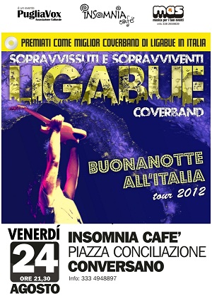 CONVERSANO (Bari) – Continuano gli appuntamenti con la rassegna “Musica Sotto il Castello” di Conversano organizzata da Insomnia Cafè in collaborazione con MAS Agency e PugliaVox. Venerdì 24 agosto, ore 21,30, è la volta della band “Sopravvissuti e Sopravviventi” che presenta “BUONA NOTTE ALL’ITALIA TOUR 2012”.