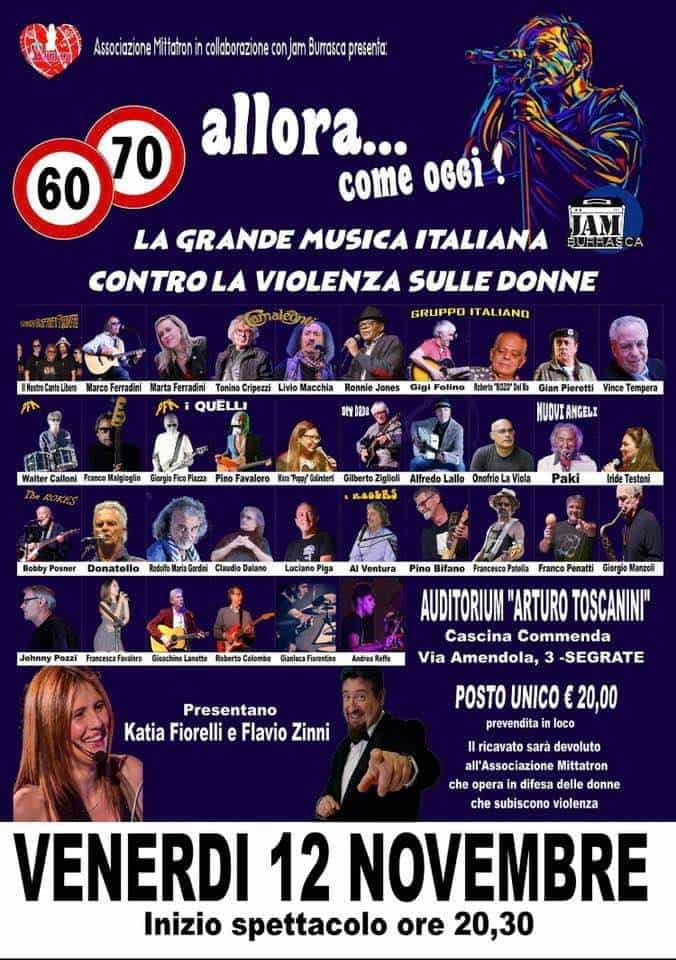 La grande musica italiana “Allora…come oggi!” contro la violenza sulle donne, venerdì 12 novembre 2021 alle 20.30 a Segrate all’Auditorium Arturo Toscanini alla cascina Commenda organizzato da Jam Burrasca in collaborazione e a sostegno dell’associazione Mittatron.