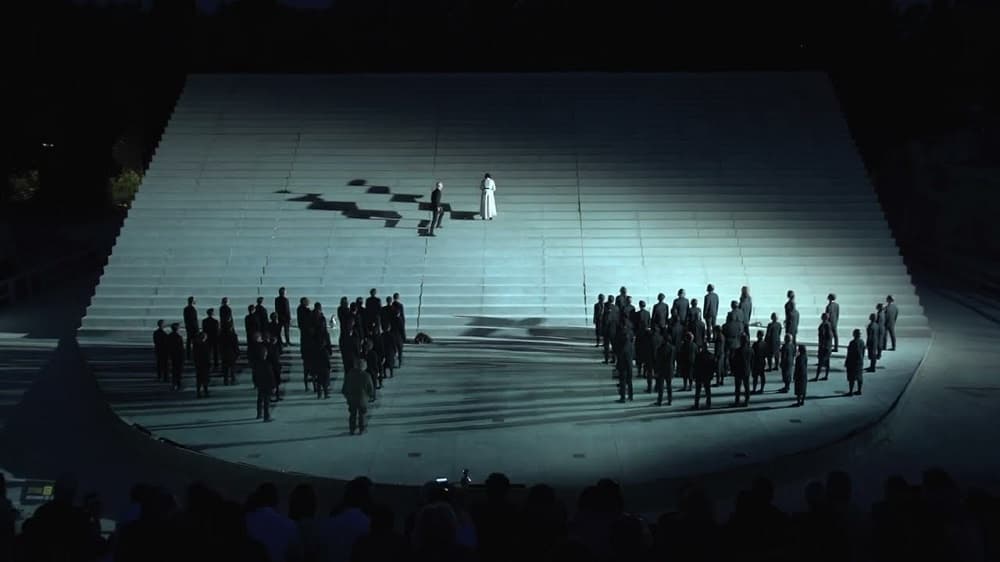 Memorabile Il raffinato gioco di luci e ombre, sempre a cura di Carsen, che gli attori producono percorrendo l’imponente scalinata.