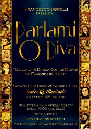 MILANO: Sabato 17 maggio 2014 alle ore 21,00 presso il Teatro Martinitt di Via Pitteri 58, Milano, Francesco Borelli presenterà lo spettacolo “Parlami o diva, Dialogo in danza con le donne più famose del 900”. Un’ora e mezza di musica, video e balletti in un crescendo di emozioni, ricordi e nostalgia. Parlami o diva è un viaggio nel 900, un dialogo immaginario con le donne che hanno reso unico, e a tratti immaginifico, il secolo scorso. Le dive del cinema, della musica, delle passerelle; le icone che con la loro bellezza e straordinaria personalità, hanno regalato a noi, pubblico adorante, sogni e speranze, momenti di riflessione e leggerezza, distrazione e attimi di pura e grandissima arte. Lo spettacolo è composto da 4 quadri principali in cui, seppure in maniera succinta, si raccontano le storie di Evita, Marilyn, la Principessa Diana e Maria Callas. Nel caso di quest’ultima si omaggia la voce facendo riferimento alle sue interpretazioni di Traviata, Carmen e Norma con la splendida Casta Diva che chiude il primo tempo in maniera suggestiva. Poi spots su Doris Day, Sophia Loren, Rita Haworth, Barbara Streisand, Madonna, Anna Magnani, Grace Kelly, Audrey Hepburn e altre. In alcuni casi vengono utilizzate le canzoni o le musiche che le hanno contraddistinte, in altri invece, alcune canzoni vengono usate come pretesto per ricordarle attraverso assoli, passi a due o balletti di insieme. Tutti i quadri sono preceduti da lettere inviate da ciascuna di queste stelle, che si presentano al pubblico attraverso i propri ricordi e le proprie frasi celebri. Attrici, cantanti, principesse, donne le cui vite artistiche e personali, intessute di grandi successi e sogni infranti, hanno accompagnato le nostre vite e ancor prima quelle dei nostri genitori e dei nostri nonni. Stelle, che platee immerse nelle tenebre contemplavano rifulgere sull’argenteo schermo o sulle riviste patinate. Quasi costellazioni di un cielo notturno. Lettere inviate dal passato o nel presente. Canzoni, parole e immagini, che scolpite nelle nostre memorie, hanno reso l’esistenza più leggera, a volte frivola, ma decisamente più bella e più ricca. Bert Stern, colui che attraverso le sue fotografie rese immortali tante dive del passato, disse, a proposito della morte di Marilyn: “ Ora se n’è andata, eppure è dappertutto. Le stelle muoiono ma la loro luce dura per sempre”. Alcune ci hanno lasciato, altre continuano a farci sognare… ”Parlami o diva” è un omaggio a tutte loro e alla loro eterna straordinarietà.