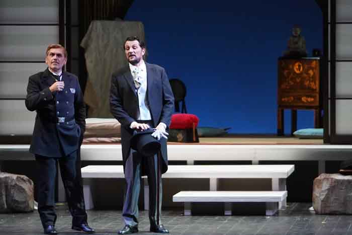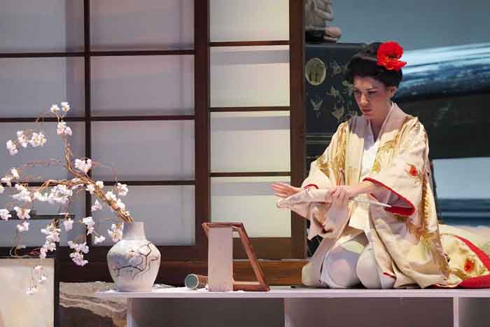 Il tema di questa Cio-Cio-San è quello dell’equivoco di questa giovane geisha. Cio-Cio-San ha creduto di essere diventata americana e di poter invocare le leggi degli States per emanciparsi come donna. E che invece verrà abbandonata dall’americano farfallone Pinkerton. Che dopo tre anni ritornerà con la nuova moglie americana (Eva Corbetta) per riprendersi il bambino nato dalla protagonista giapponese. Vicenda che negli scorsi decenni ha avuto famosi riscontri cinematografici come quelli con Cary Grant e Sylvia Sidney. Fino all’indimenticabile debutto, al Festival dei due mondi di Spoleto del 1983, dell’allestimento di Ken Russel. Russel che sottolineò con soluzioni anticonvenzionali questo irrisolto dramma della protagonista che alla fine si toglierà la vita lasciando il figlioletto “Dolore” deliziosamente interpretato da Viktor Pastori.