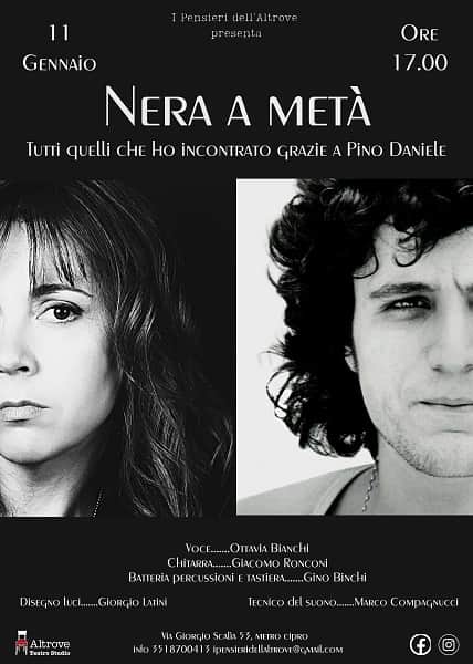 Il nuovo anno dell’Altrove Teatro Studio si apre con Nera a metà di Ottavia Bianchi, spettacolo musicale e autobiografico in scena giovedì 11 gennaio alle ore 17 in prima assoluta. Un viaggio nel cuore della musica di Pino Daniele, tra vinili proibiti, ricordi d’infanzia e la voce intensa di Ottavia Bianchi, accompagnata da Giacomo Ronconi alla chitarra e Gino Binchi alle percussioni.
