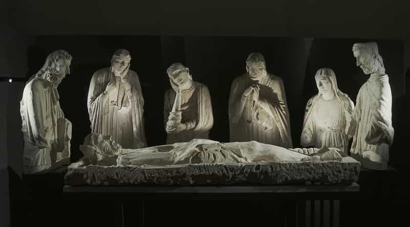 Le restauratrici del settore materiali lapidei dell’Opificio sono state impegnate fin dall’arrivo del gruppo scultoreo a Firenze, nel novembre 2013, nella pianificazione di una approfondita campagna diagnostica per lo studio del materiale costitutivo, delle tecniche artistiche e degli interventi pregressi. Per questo sono state attivate alcune collaborazioni con importanti centri di ricerca. Il complesso intervento di restauro che è seguito ha portato al recupero e alla stabilizzazione dello stato di conservazione del capolavoro scultoreo. Durante il lavoro è stato predisposto il rilievo tridimensione delle parti inferiori delle sculture per recuperare le basi di appoggio perse, resecate, nel tempo. Le nuove basi, perfettamente giustapposte al materiale lapideo, sono state realizzate tramite fresatura a controllo numerico in materiale sintetico e infine stuccate a tono. In ultimo, ma non ultimo per importanza, il servizio di Climatologia e Conservazione Preventiva dell’OPD ha definito i parametri ambientali della nuova sede espositiva, determinanti per la conservazione del Compianto sul Cristo morto. Attribuito al Maestro di Sant’Anastasia – poi identificato come Rigino di Enrico, sebbene di costui non sono noti legami documentati con nessuna delle opere che gli sono state assegnate – il gruppo scultoreo è costituito dal Cristo deposto nel sudario, attorniato da sei dolenti a grandezza naturale.