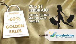 Risparmiare facendo shopping? A Mondovicino Outlet Village si può! Sabato 20 e domenica 21 febbraio 2016 la promozione Golden Sales offrirà infatti sconti del 60% sul prezzo outlet su tutto l’assortimento delle boutiques aderenti all’iniziativa, che si alterneranno durante le due giornate e offriranno a turno due ore di super convenienza.