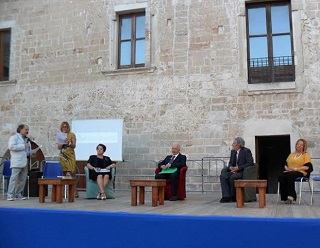 Scanso le borse, stacco il vestito, trascino anche una valigia, poi abbasso la testa sotto un magnifico fico. Finalmente l’ombra e l’atrio esterno della stanza. L’accoglienza è già parte di ciò che mi aspettavo. Mi piace quel caldo secco ventoso e quello scambiarsi parole, intensamente umili, con chi li lavora. Alle diciotto ci ritroviamo nella piazza tra il Santuario e il Palazzo Marchesale. Vedo tante facce curiose: eccoli gli artisti, se ne vede l’abbigliamento e se ne sentono gli accenti. L’Europa può divenire piccola se c’è l’incontro, se tutti nel dialogo cerchiamo il giusto comune presente. Confesso che quel che avrei ascoltato di lì a poco, non me lo aspettavo. Mi convinco sempre più che il caso arricchisce il fato e che certi attimi scaturiscono improvvisi e d’impatto ti cambiano la mente … e la vita!