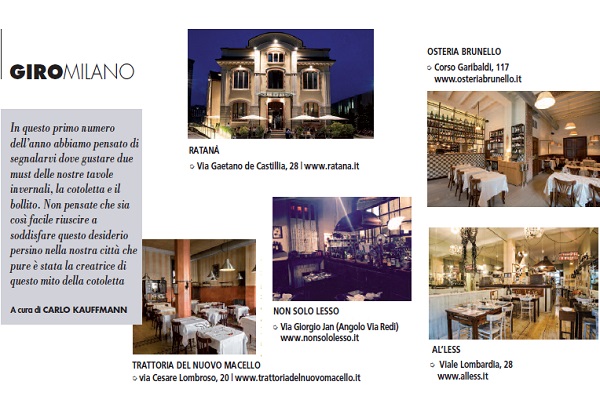 In questo primo numero dell’anno abbiamo pensato di segnalarvi dove gustare due must delle nostre tavole invernali, la cotoletta e il bollito. Non pensate che sia così facile riuscire a soddisfare questo desiderio persino nella nostra città che pure è stata la creatrice di questo mito della cotoletta.
